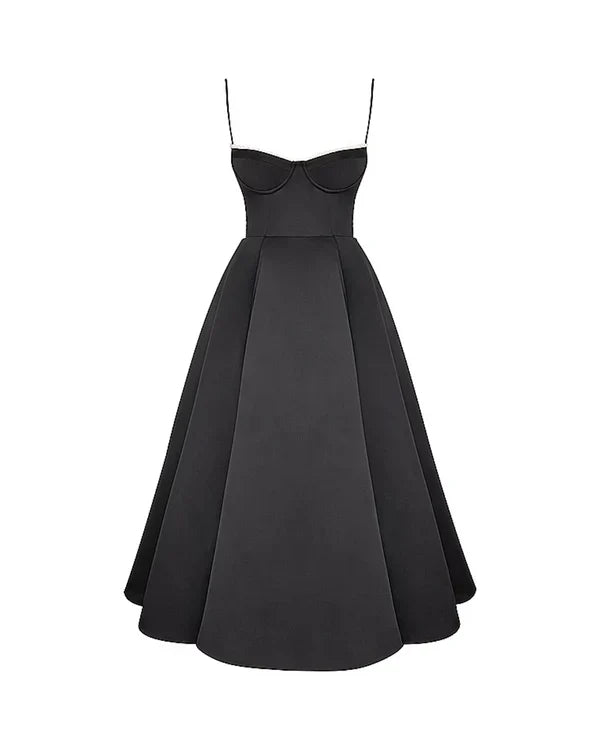 Nuestro vestido midi “Selene” combina elegancia y encanto con su tejido satinado brillante y suave malla elástica. El corpiño con ballenas realza la cintura y el escote corazón con copas aporta soporte y feminidad. Los tirantes ajustables garantizan un ajuste perfecto, mientras que la falda midi con tul añade volumen y un toque de glamour sofisticado.